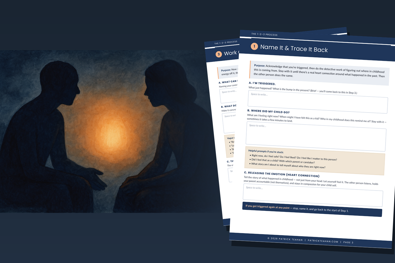 Most couples and close relationships fall into one of three patterns when conflict hits: the same fight on repeat, parallel lives where nothing real gets said, or eventually breaking up. The 1-2-3 Process — developed by Amanda Curtin, LICSW — interrupts that pattern. It's a structured way to move from being triggered (numb, reactive, righteous, or shut down) back into a heart connection with the person in front of you.